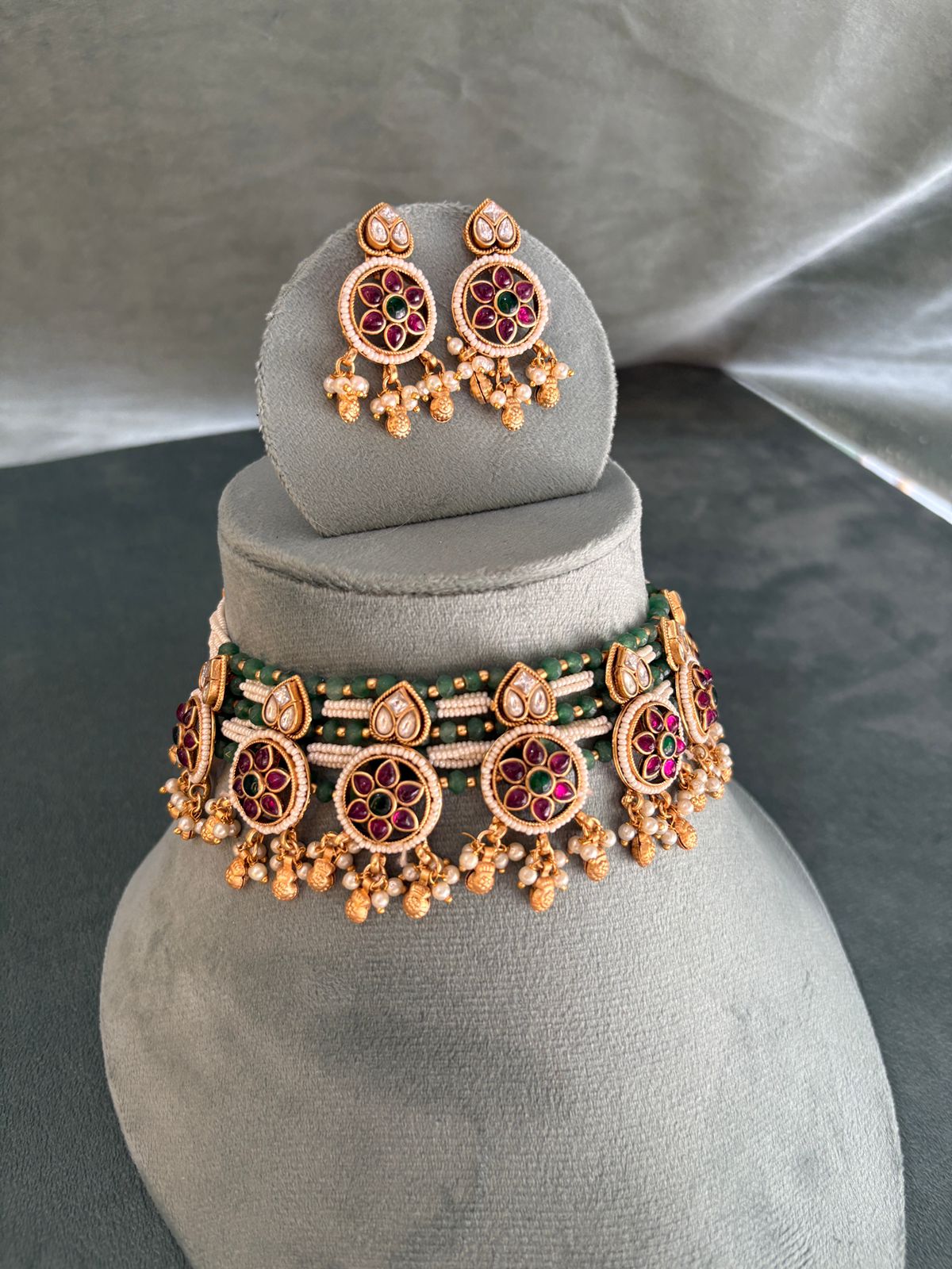 An Indian chokar is a traditional necklace that sits snugly around the neck, typically crafted with intricate detailing and luxurious materials. It is known for its bold, ornate appearance and often serves as the centerpiece of a bridal or festive jewelry ensemble.