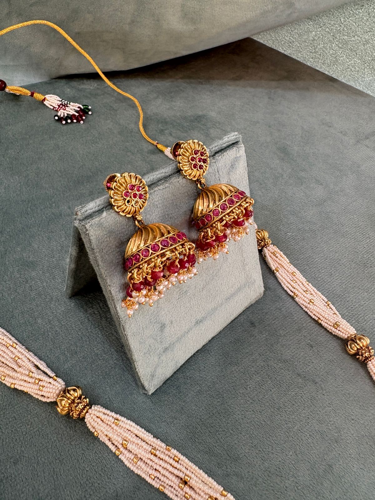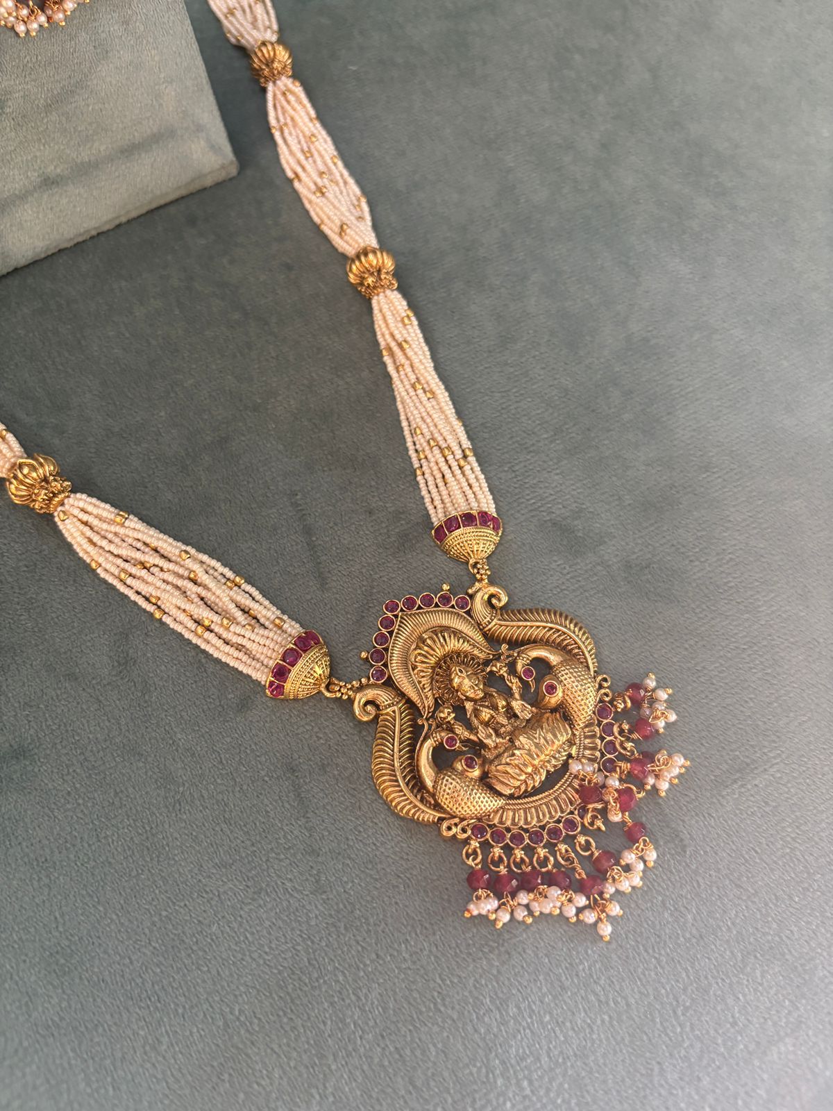 The design is elaborate, often forming a choker or collar style that gracefully adorns the neckline, cascading down with layers of beads, pearls, or jhumka-style pendants. Rich in detail and grandeur, the necklace is typically worn at weddings and festive occasions, symbolizing prosperity, tradition, and timeless beauty.