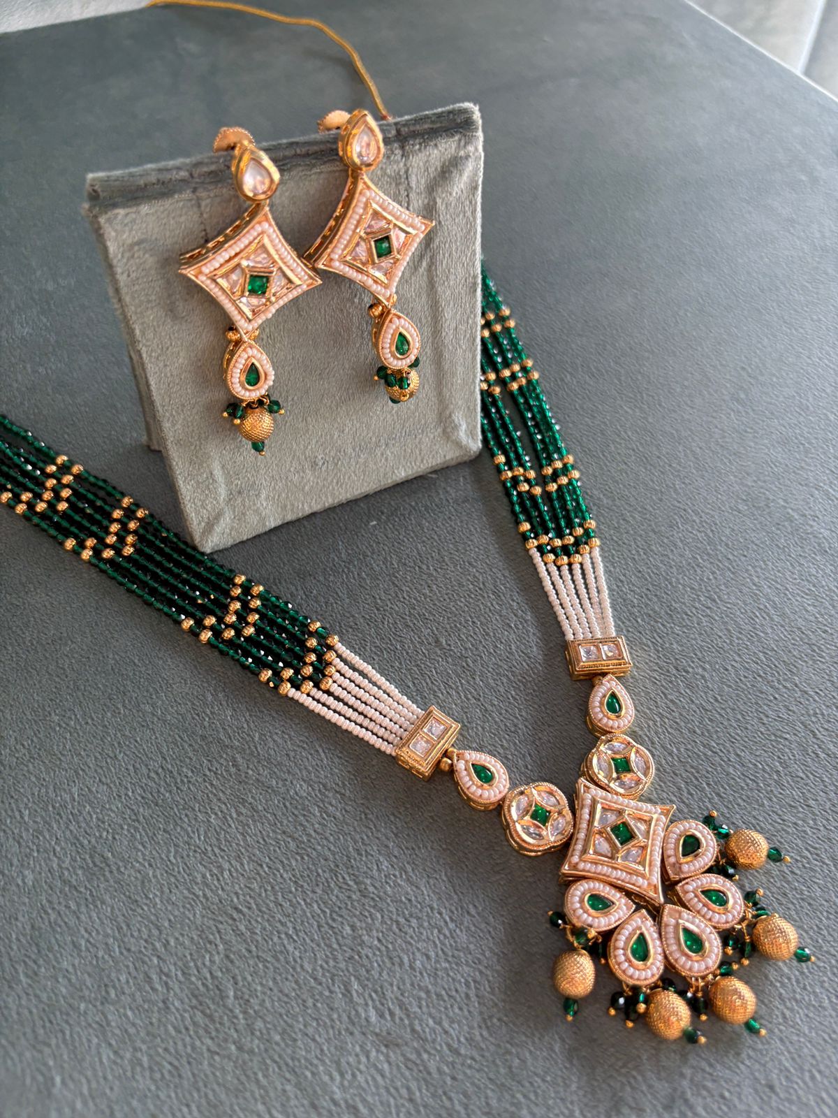 This exquisite Indian necklace is a celebration of traditional craftsmanship and cultural heritage. Intricately handcrafted, it features a harmonious blend of vibrant gemstones, delicate gold filigree, and ornate motifs inspired by Indian mythology and nature. The necklace often showcases elements such as kundan (glass stone in gold foil), meenakari (enamel work), or polki (uncut diamonds), reflecting royal Mughal influences.